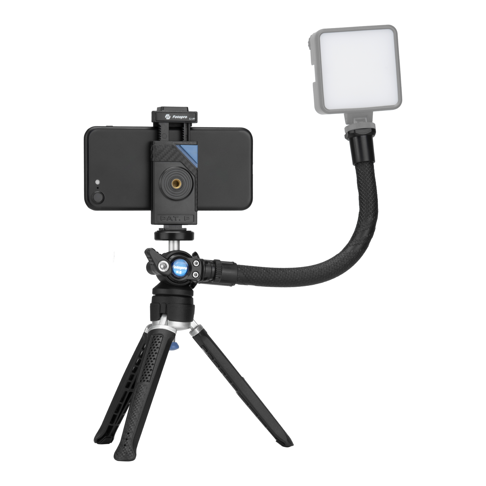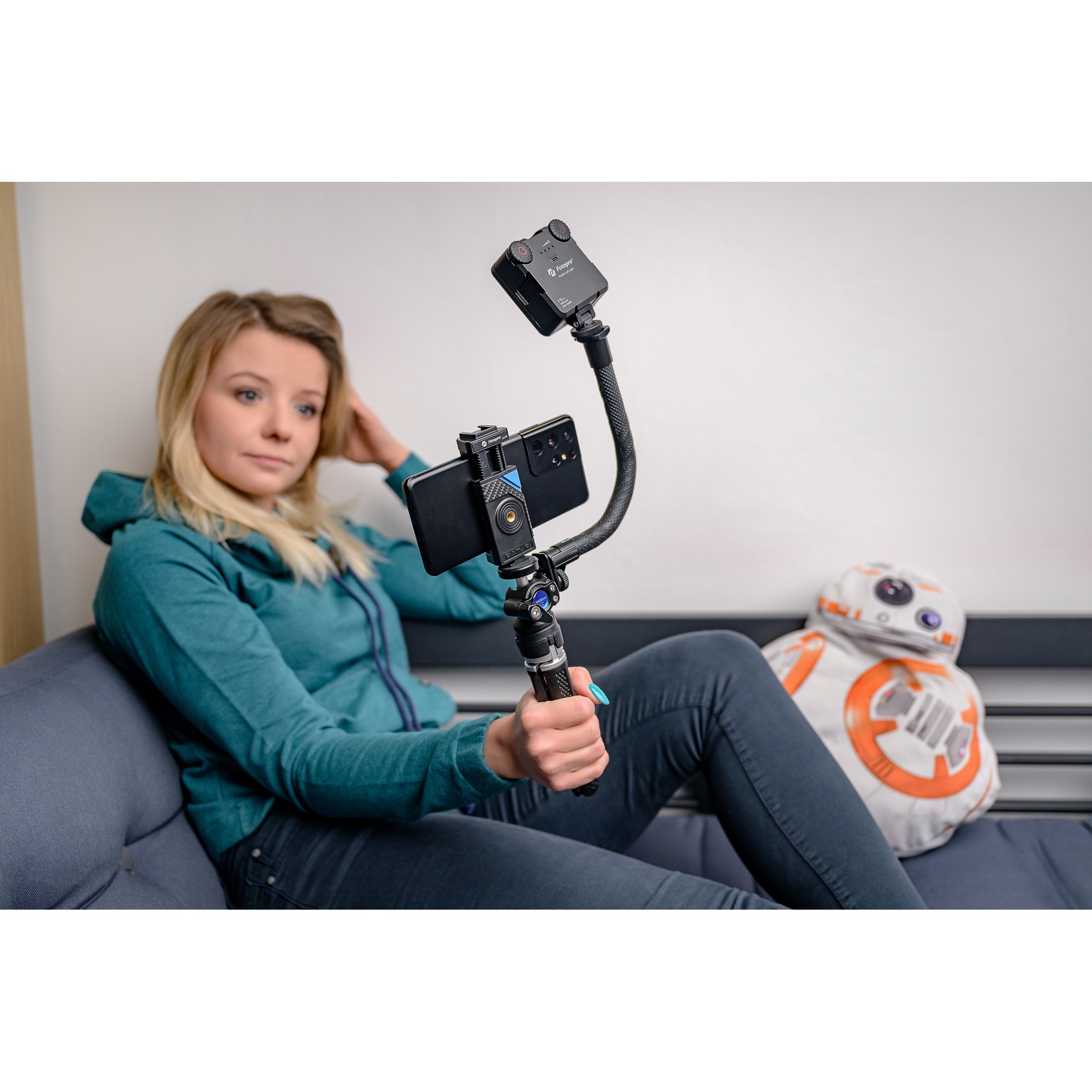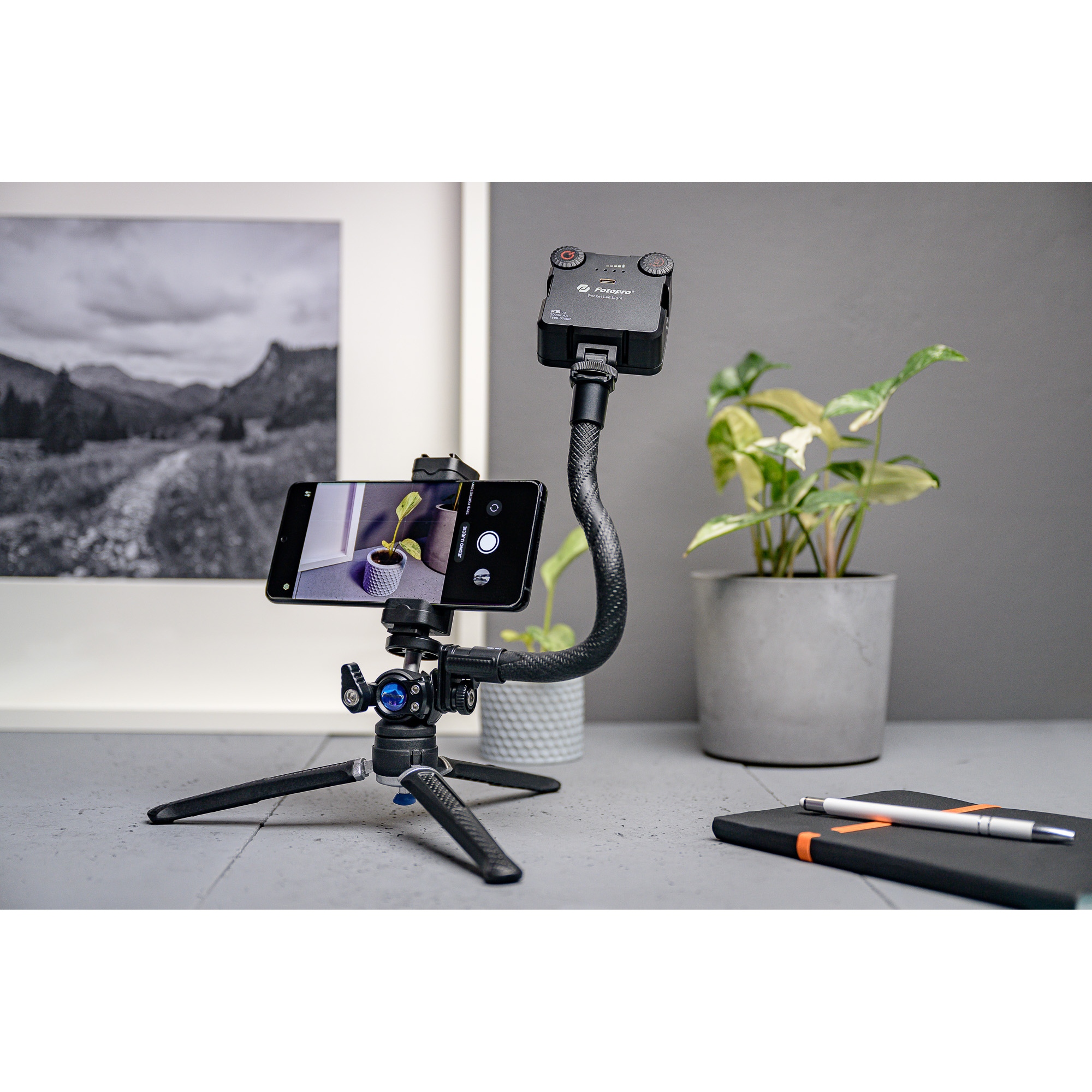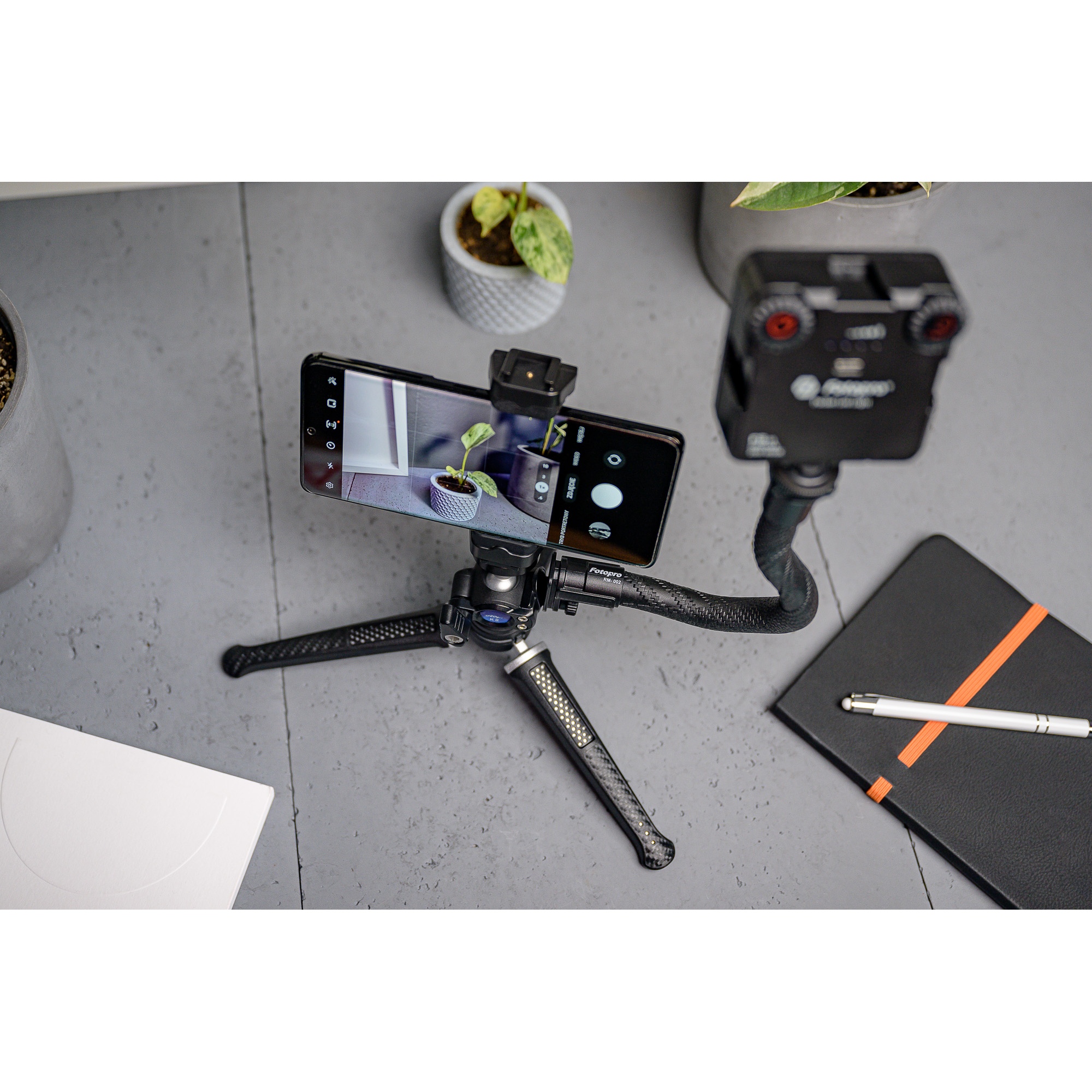 Zestaw Fotopro Python FireKit I to wszystko, czego potrzebujesz, aby w ciągu kilku sekund stworzyć przenośne stanowisko pracy, umożliwiające nagrywanie vlogów i transmisji, a także udział w wideokonferencjach i zdalnych lekcjach. Uchwyt na smartfon z dodatkowymi punktami montażowymi, poręczna głowica kulowa i elastyczne ramię Fotopro RM-022 pozwolą precyzyjnie ustawić telefon pod wybranym kątem, a także skorzystać z dodatkowych akcesoriów, takich jak mikrofony, lampy LED lub kamery sportowe.